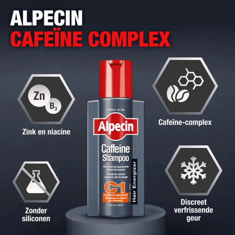 De shampoo die de haargroei direct in de wortels stimuleert. Het werkzame cafeïne-complex gaat actief haaruitval tegen. Tijdens het wassen van het haar zal de cafeïne doordringen tot de haarwortels om zo de negatieve werking van testosteron te blokkeren. Het resultaat: krachtige haargroei met voelbaar meer haar. Het cafeïne-houdende werkzame complex van Alpecin zorgt ervoor dat de groeifases van het haar bij erfelijk bepaalde haaruitval worden verlengd. Zo blijft de volle bos haar langer vol! Daarnaast zijn er geen siliconen toegevoegd aan Alpecin Cafeïne-Shampoo C1. Hierdoor zal fijn en futloos haar meer hold en volume krijgen, en is zo makkelijker in model te brengen.