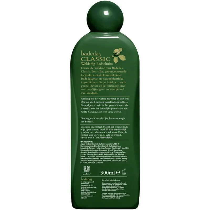 Wanneer je een ontzettend drukke dag hebt gehad, wil je natuurlijk niets liever dan een lekker lang bad nemen. Of je springt juist het liefst in bad als je net je bed uit komt en fris de dag wilt beginnen. Even alle gedachten van je afgooien en genieten van het heerlijke warme water. Badedas Classic Badschuim helpt je hierbij. Of je er nu de dag mee wil beginnen, mee wil eindigen of tussendoor een bad wil nemen, Badedas Classis Badschuim is er voor ieder moment! Dit badschuim helpt je te ontspannen en de reinigende werking zorgt voor een fris en schoon gevoel. Het enige wat je hoeft te doen is een kleine hoeveelheid Badedas Classis Badschuim aan het warme water toevoegen en de rest gaat vanzelf. Ontspan jezelf in de rijke laag schuim die wordt gecreëerd en geniet van de heerlijke, frisse geur van dennenolie. Badedas Classis Badschuim bevat wilde kastanje-extract, dat bekend staat om zijn vitaliserende werking. Badedas is al sinds 1961 een van de meest vertrouwde merken in de Nederlandse badkamers. Vanwege de heerlijke geuren en de frisse reiniging van de Badedas Badschuimen en Douchegels voel je je keer op keer weer lekker schoon en levendig. Probeer Badedas Classis Badschuim zelf en laat je meevoeren door de frisse, prikkelende geur van dennenolie.