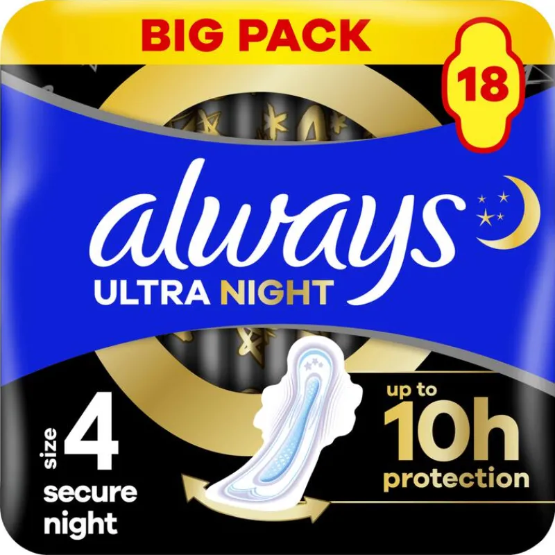 Geniet van een goede nachtrust en zeg ja tegen tot 10 uur lang bescherming: Always Ultra Secure Night maandverbanden (maat 4) met vleugels en een zacht aanvoelende absorberende toplaag hebben 3 beschermingskenmerken zodat je ’s nachts niet hoeft op te staan om te controleren of je maandverband lekt of om het te vervangen.
