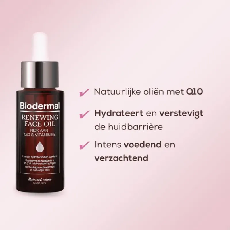 Zorg voor een jonge huid met Biodermal Renewing Face Oil. Het product bevat een unieke mix van natuurlijke oliën welke nauwkeurig zijn geselecteerd op hun voedende werking. De huid wordt zacht en stralend door de hydraterende en beschermende werking van canola-olie en spireazaadolie. De olie is verrijkt met Vitamine E en co-enzym Q10 ter bescherming tegen externe invloeden. Hiermee behoud je een jonge uitstraling. De Renewing Face Oil is geschikt voor alle huidtypen en leeftijden.