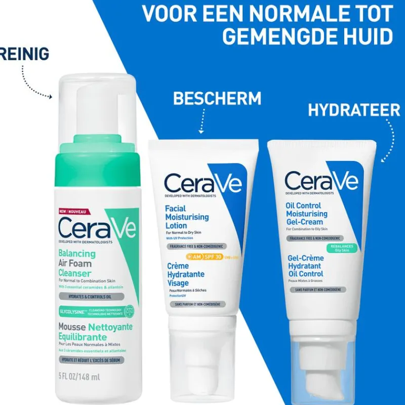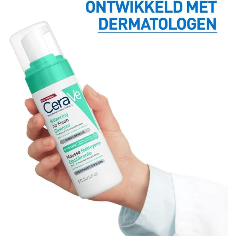 CeraVe Balancing Air Foam Reiniger is speciaal ontworpen is voor een normale tot gemengde huid. De formule bevat Glycolysine-technologie, 3 huididentieke ceramiden en Allantoïne, die samen de huid reinigen en hydrateren, en de talg verminderen. De schuimende textuur voelt zacht aan op de huid en dringt eenvoudig door om deze op milde wijze te reinigen zonder de huidbarrière te verstoren. De zachte formule is vrij van parfums en is geschikt voor een gevoelige huid. CeraVe Balancing Air Foam Reiniger is verrijkt met Glycolysine, een reinigingstechnologie die overtollige talg verwijdert om de huid in evenwicht te houden. Daarnaast helpen 3 huididentieke ceramiden de huidbarrière te versterken, terwijl Allantoïne de huid helpt te verzachten en te kalmeren. De lichte, schuimende textuur dringt door in de opperhuid en helpt de huid zachtjes te reinigen, te beschermen en te hydrateren. De formule zonder parfum is niet-comedogeen en is ontwikkeld in samenwerking met dermatologen.