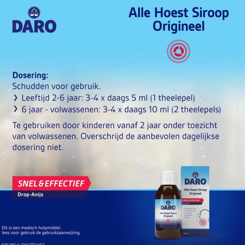 Daro Alle Hoest Siroop met aangename drop-anijs smaak werkt snel en effectief. Het behandelt symptomen van alle soorten hoest: vastzittende-, productieve-, droge,- en prikkelhoest en verlicht keelpijn. De siroop creëert een beschermend filmlaagje in de keel dat zorgt voor een snelle verlichting van droge- en kriebelhoest door de verzachtende eigenschappen. Daarnaast wordt eventueel taai slijm opgelost waardoor vastzittende- en productieve hoest verdwijnen. Daro Alle Hoest is een medisch hulpmiddel.