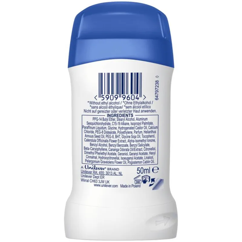 PPG-14 Butyl Ether, Stearyl Alcohol, Aluminum Sesquichlorohydrate, C15-19 Alkane, Isopropyl Palmitate, Paraffinum Liquidum, Glycine, Hydrogenated Castor Oil, Calcium Chloride, PEG-8 Distearate, Polyethylene, Parfum, Helianthus Annuus Seed Oil, PEG-8, BHT, Glycine Soja Oil, Tocopherol, Calendula Officinalis Flower Extract, Alpha-Isomethyl Ionone, Benzyl Alcohol, Benzyl Benzoate, Benzyl Salicylate, Beta-Caryophyllene, Cananga Odorata Oil/Extract, Citronellol, Dimethyl Phenethyl Acetate, Geraniol, Geranyl Acetate, Hexyl Cinnamal, Hydroxycitronellal, Isoeugenyl Acetate, Linalool, Pelargonium Graveolens Flower Oil, Pogostemon Cablin Oil.