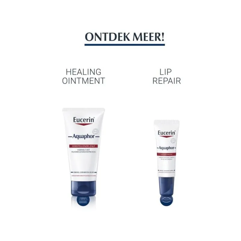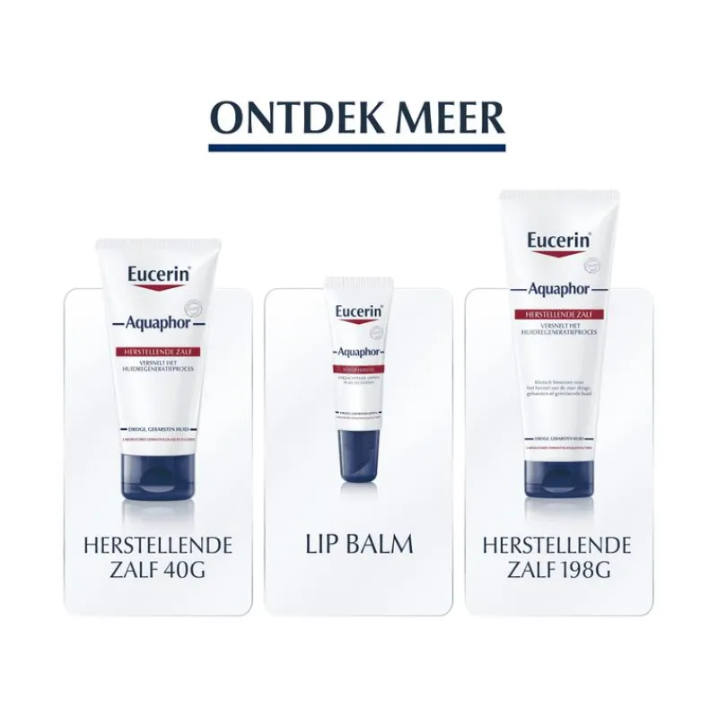 Klinische studies bewijzen dat Eucerin Aquaphor de regeneratie van beschadigde en gebarsten huid bevordert. Deze formule op basis van paraffine (zonder water) helpt de gebarsten huid sneller te herstellen door de ideale omgeving te creëren. Paraffine is een minerale olie die een soort laagje over de huid legt, waardoor er weinig tot niks in en uit de huid kan. De zalf genereert hiermee een beperkt doorlaatbare (semi-permeabele) beschermende laag, waardoor de huid gehydrateerd blijft en het huidherstellende proces versnelt. De actieve ingrediënten Panthenol and Bisabolol zijn beide klinisch bewezen effectief in het herstellen van de gebarsten huid. Eucerin Aquaphor bevat daarnaast Glycerine dat hydrateert en dat de huidbarrière beschermt. Naast haar helende functie, beschermt en verzacht het de huid ook. Klinische studies bewijzen effectiviteit tijdens de behandeling van extreem droge, gebarsten of geïrriteerde huid, veroorzaakt door een dermatologische behandeling zoals een laser therapie, een chemische peeling of dermabrasie. Tevens is Eucerin Aquaphor aan te raden voor xerose (extreem droge huid). Ook geschikt voor baby’s, om hun rode billen te verzachten. Dankzij het minimaal aantal ingrediënten is er een uitstekende huidverdraagzaamheid. Het product is zacht, niet-comedogeen, zonder geurstoffen, zonder parfum, zonder kleurstoffen en zonder bewaarmiddelen.