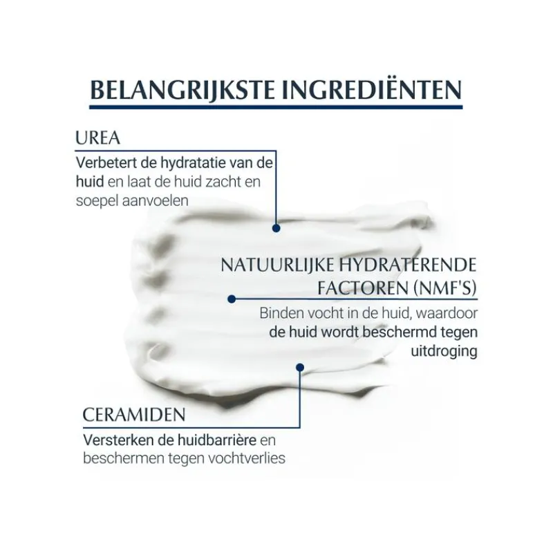 Urea is een van de stoffen die de huid zelf produceert om het eigen vochtgehalte te reguleren en is een ‘natuurlijke vochtinbrengend bestanddeel’ (NMF). Urea is hygroscopisch en werkt waterverbindend in de bovenste huidlaag, de hoornlaag. Urea is ook keratolytisch, wat betekent dat het de verbindingen tussen de dode huidcellen verbreekt, waardoor vervelling ontstaat en het huidoppervlak zachter wordt. Omdat urea een huideigen bestanddeel is, wordt het zeer goed verdragen, zelfs door mensen met een zeer droge huid.