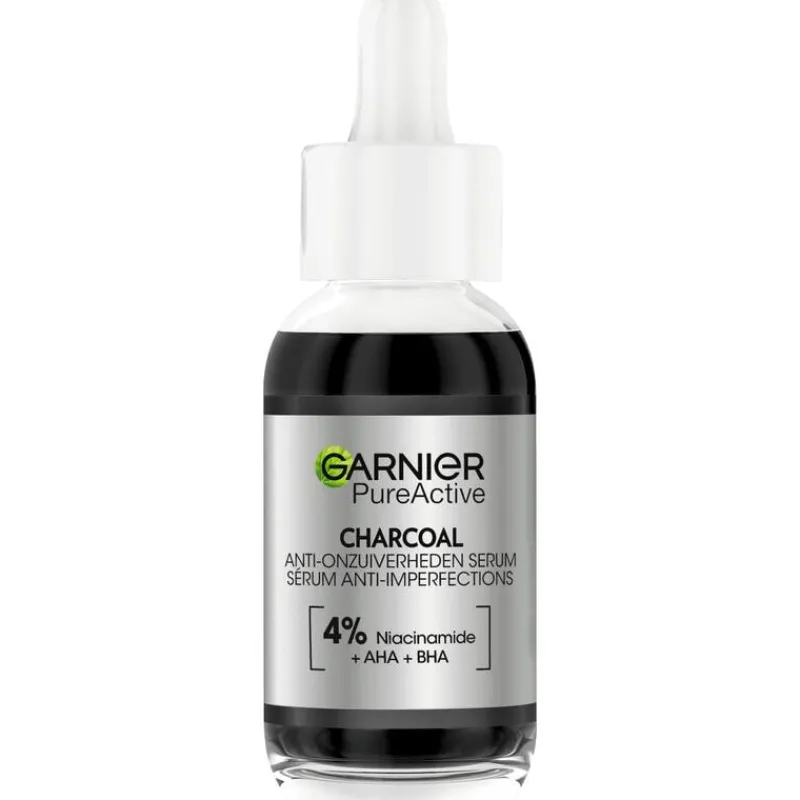 Garnier PureActive Anti-Onzuiverheden Serum met AHA + BHA & Charcoal is ons 1ste zwarte serum, geconcentreerd met 4% [NIACINAMIDE + AHA + BHA], vermindert puistjes en de zichtbaarheid van vlekjes en imperfecties. Het maakt de huid gladder en laat deze er egaler uitzien. AHA staat bekend om het exofoliëren van de doffe & oneffen huid, BHA helpt puisten & poriën te verminderen, en niacinamide staat bekend om een oncomfortabel gevoel bij puistjes te verzachten. Charcoal is een ingrediënt van natuurlijke oorsprong dat wel bekend is om haar zuiverende en matterende werking Ontdek ook de andere producten van Garnier PureActive voor een gladdere en gematteerde huid!
