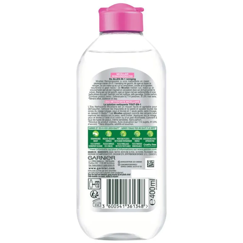 Garnier SkinActive Micellair Reinigingswater voor de Gevoelige Huid – Milde Gezichtsreiniging – Zachte Make-Up Remover – 400ml Een gezicht reinigingsmiddel geschikt voor de meest gevoelige huid en perfect als make-up remover. Productbeschrijving Verwijder make-up en reinig je huid in één beweging met Garnier SkinActive Micellair Reinigingswater. Micellair reinigingswater is een vervanging voor het gebruik van reinigingsdoekjes. Reinigt en verzacht de gevoelige huid Verwijdert make-up in één beweging zonder veel wrijven en irritaties Milde make-up remover zonder parfum en alcohol* Gezichtsreiniging zonder de huid uit te drogen dankzij het hydraterende effect De gemakkelijkste manier om in één handeling het gezicht, de ogen en de lippen te reinigen en make-up te verwijderen, zonder wrijven en af te spoelen. Deze parfumvrije, hydraterende formule reinigt de huid zonder deze uit te drogen. Het resultaat De volgende resultaten worden behaald in één micellair water handeling: De gevoelige huid is gereinigd Make-up is verwijderd zonder hard te wrijven of af te spoelen De huid voelt zacht en gehydrateerd aan De voordelen voor een gevoelige huid Garnier Micellair Reinigingswater is een gezichtsreiniger met een zachte, parfumvrije formule en is geschikt voor alle huidtypes, ook voor de meest gevoelige huid. De micellen trekken vuil aan als een magneet waardoor het vuil en onzuiverheden zoals overtollig talg verwijdert van jouw gezicht. Daarnaast bevat het Micellair Reinigingswater geen alcohol, waardoor het product geschikt is voor alle delen van het gezicht, zonder irritatie.