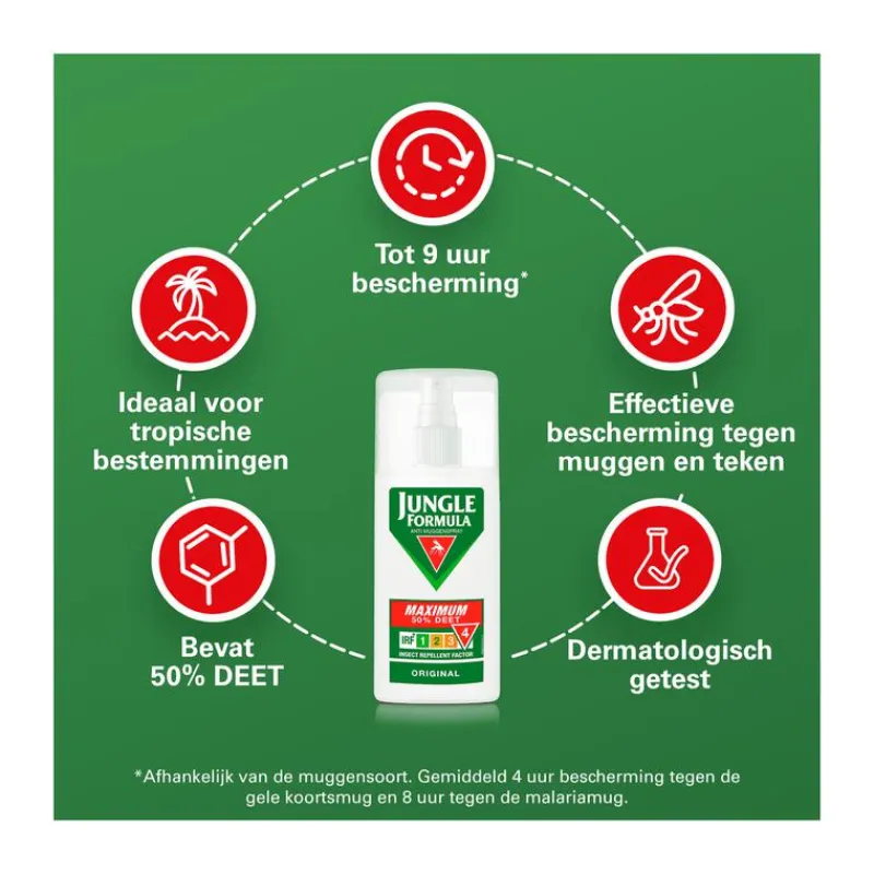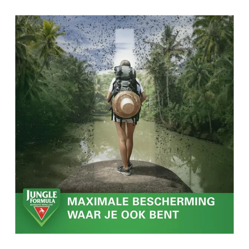 Jungle Formula Maximum Original is een antimuggen spray met 50% DEET en plantenextracten voor een sterke bescherming. Deze muggenspray heeft een aangename geur en geeft wel 9 uur bescherming tegen alle soorten muggen inclusief de Tijgermug en andere stekende of bijtende insecten. Ideaal voor gebruik binnen- en buitenshuis & voor vakanties in Europa.Deze muggenbescherming ideaal voor tropische, bosrijke gebieden en in de omgeving van meren. Voor gebruik in gebieden met een hoog risico op malaria of andere door insecten overdraagbare ziekten.Ideaal voor tropische, bosrijke gebieden en in de omgeving van meren.Alle producten van Jungle Formula bevatten een IRF®. Hoe hoger de IRF®, hoe sterker de bescherming. Jungle Formula is er in IRF2, IRF3 en IRF4 variante