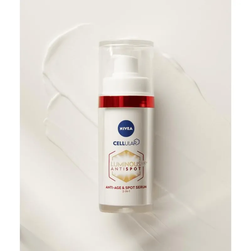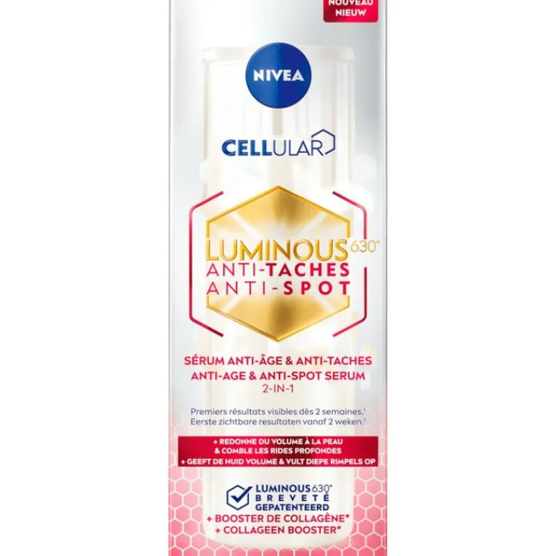 Maak je huidverzorgingsroutine compleet met NIVEA CELLular LUMINOUS630 Anti Age & Anti Spot Serum. Verminder 10 jaar aan opgebouwde ouderdomsvlekken met zichtbare resultaten vanaf 2 weken. Tegelijkertijd versterk je de structuur van de huid en geniet je van een steviger gelaat dat jonger oogt. Diepe rimpels worden vanaf 7 dagen opgevuld voor een egale, jonger uitziende huid met meer volume. Het NIVEA Anti-spot Luminous serum is effectief dankzij LUMINOUS630, dat de melanineproductie in balans brengt en ouderdomsvlekjes vermindert. Tegelijkertijd is het een rijk collageen serum dat de rijpere huid een boost geeft. Collageen zorgt voor de stevigheid en structuur van je huid. Door dit stofje aan te vullen, worden rimpels minder zichtbaar en voelt je huid veerkrachtiger aan.oor optimale resultaten en bescherming tegen ouderdomsvlekjes, gebruik het serum in combinatie met de NIVEA Cellular Luminous630® Anti Spot dagcrème met SPF 50. • Zichtbare vermindering van ouderdomsvlekjes • Verstevigt en versterkt de huid • Verrijkt met LUMINOUS630 en collageenbooster • Ontwikkeld voor de rijpere huid • Vermindert rimpels en fijne lijntjes