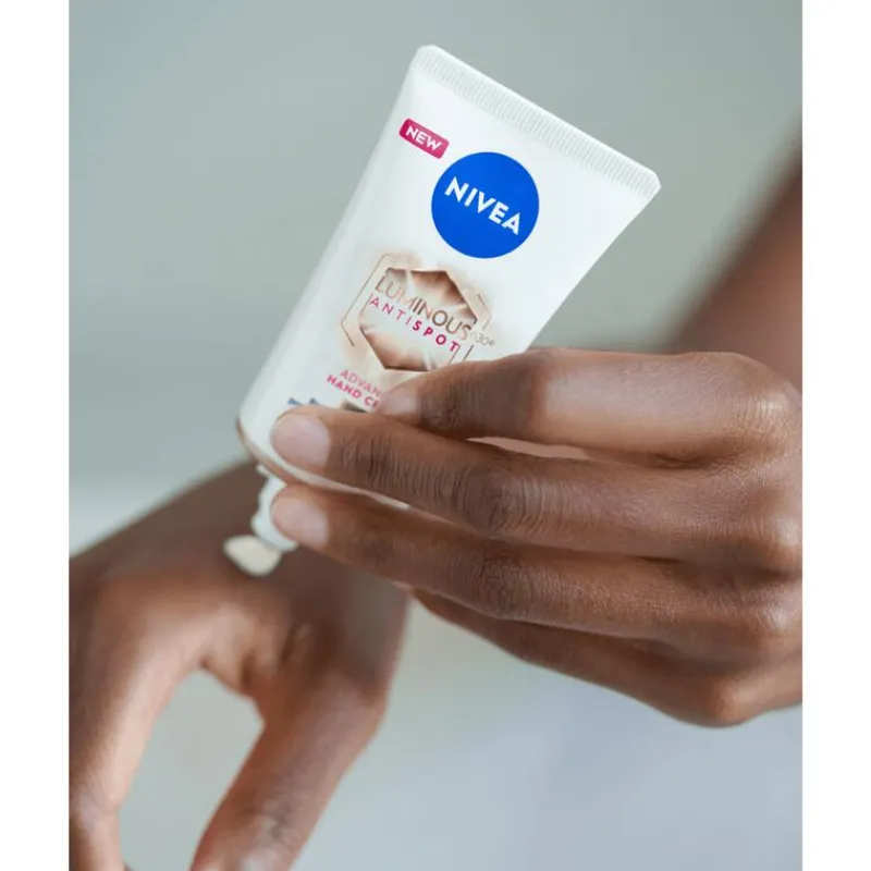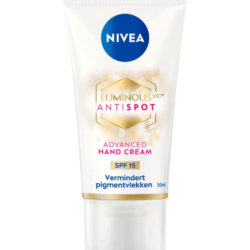 NIVEA Luminous630 Anti Spot Handcreme Anti Pigment zorgt bewezen voor gladde, zachte en vooral een jonger aanvoelende huid. De innovatieve formule verrijkt met Luminous630 en het huidherstellende serum hyaluronzuur vermindert vlekken op de handen en helpt nieuwe pigmentvlekken te voorkomen. Tegelijkertijd worden droge handen intensief gevoed gedurende 24 uur. SPF 15 helpt de handen te beschermen tegen door het zonlicht veroorzaakte donkere vlekken en photo-aging. De handcrème vermindert tevens het ontstaan van fijne lijntjes en rimpels. De SPF 15 beschermt de huid van de handen tegen zonlicht en heeft een anti-age effect omdat het de vorming van rimpels vermindert. Ervaar zelf het verzachtende gevoel van deze anti pigment handcrème.
