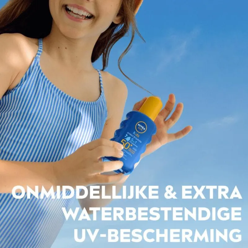 NIVEA SUN Kids Protect & Hydrate Zonnebrand Spray is speciaal ontwikkeld voor de tere huid van jonge kinderen. Dit is een effectieve spray met SPF 50, die de huid beschermt tegen zonnebrand en andere schade, veroorzaakt door de zon. Naast SPF 30 geniet je van de voedende kwaliteit van amandelolie. Dit is een natuurlijke vochtinbrenger die rijk is aan antioxidanten. Zo wordt de huid van binnenuit beschermd tegen schade. De toevoeging van glycerine zorgt voor een sterkere huidbarrière en extra intensieve voeding van de huid. Gebruik de waterdichte spray ook tijdens het zwemmen of voor een dag op het strand. Een unieke kwaliteit van zonnebrand spray is dat deze zonnebrand voor kinderen een leuk kleurtje heeft. Dankzij de handige sprayflacon is het eenvoudig om de huid gelijkmatig in te smeren. De formule trekt snel in, dus je hebt geen last van een plakkerig gevoel. Het is niet voor niets dat NIVEA SUN het meest gekozen merk zonbescherming voor kinderen is.
