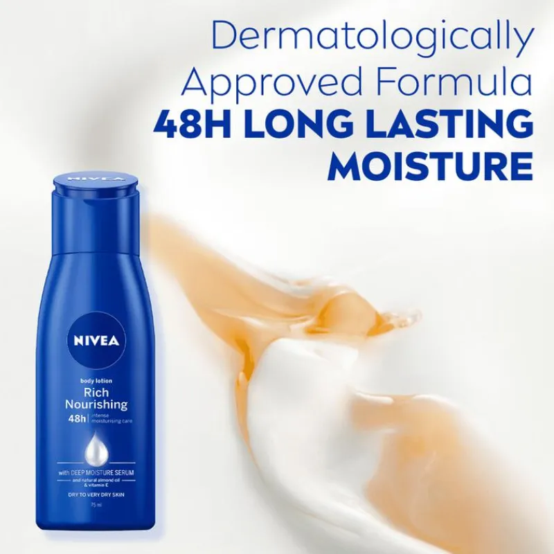 De NIVEA body milk is perfect voor dagelijkse lichaamsverzorging en ideaal voor mensen die op zoek zijn naar een body lotion die langdurige hydratatie biedt. Of je nu kiest voor een snelle oppepper voor je droge huid of een moment van ontspanning, deze body milk zorgt voor een zacht huidgevoel zonder vettig laagje. Verwen je huid met de verzorging die het verdient en ervaar de NIVEA kwaliteit voor een gezonde, stralende huid. *Corneometrie meting, 40 vrouwen, 2016