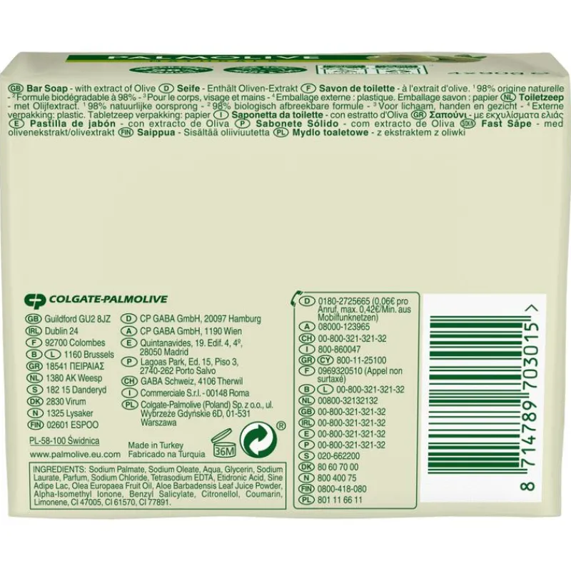 Zorg goed voor je huid door je te wassen met Palmolive Naturals Moisture Olijf Blokzeep. Of je dit stuk zeep nu gebruikt voor je handen of onder de douche, je huid voelt schoon, zacht en gehydrateerd aan dankzij de toevoeging van 100% olijvenextract. Laat je hele lichaam lekker ruiken met deze blokzeep. De missie van Palmolive is om de natuur binnen handbereik te brengen en je te inspireren meer balans te vinden in je dagelijkse hectische leven. Met een klein beetje natuur wil Palmolive je helpen om je weer meer mens te voelen. Palmolive producten zijn ontwikkeld voor mensen die zoeken naar verzorgingsproducten die rekening houden met je huid en met de planeet. Alle Palmolive Naturals producten bevatten zoveel mogelijk natuurlijke ingrediënten en hebben zo min mogelijk impact op het milieu.