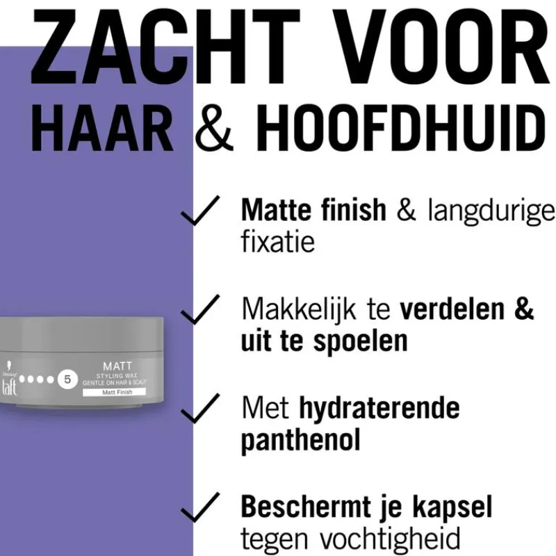 Taft Matt Styling Wax voor een matte finish. Het geeft je haar tot 24 uur sterke hold en structuur.