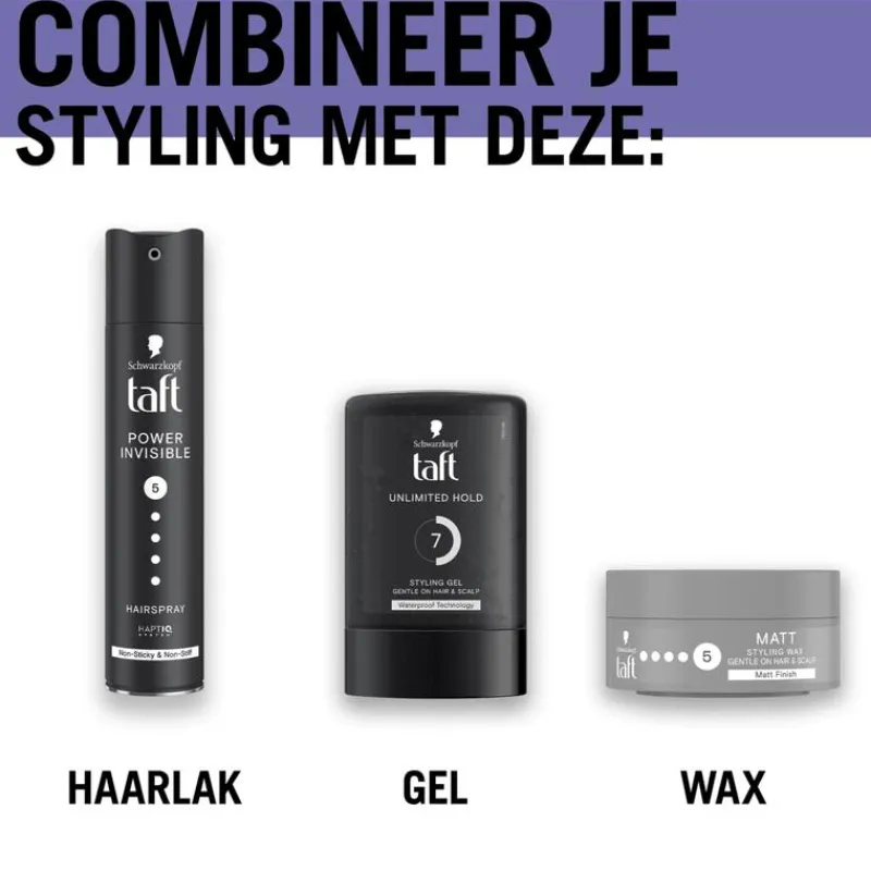 - Voor extra hold gedurende de dag combineer je de wax met de Taft Power Invisible Haarspray