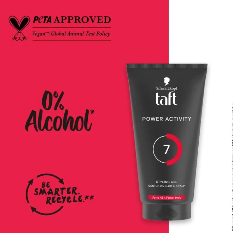 Taft Power Activity Styling Gel versterkt het haar van de haaraanzet tot in de puntjes. De gel heeft een transparante textuur en langdurige hold. Deze gel is zacht voor haar en hoofdhuid en bevat hydraterende panthenol. Het helpt het haar te beschermen tegen vochtigheid en wind. Alle Taft formules zijn vegan* en PETA gecertificeerd**.