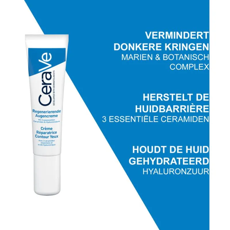 CeraVe’s Verbeterende Oogcrème helpt bij het verzachten en herstellen van de delicate oogcontouren en vermindert donkere kringen en wallen. De formule is niet-vet en absorbeert snel in deze zone. De oogcrème is rijk aan zee- & botanische extracten die donkere kringen en wallen verminderen. Het helpt het bij het verzachten en herstellen van de delicate oogcontouren. 3 essentiële ceramiden herstellen en beschermen de natuurlijke barrière, terwijl hyaluronzuur fijne lijntjes glad maakt en hydrateert en niacinamide de huid verzacht en kalmeert.