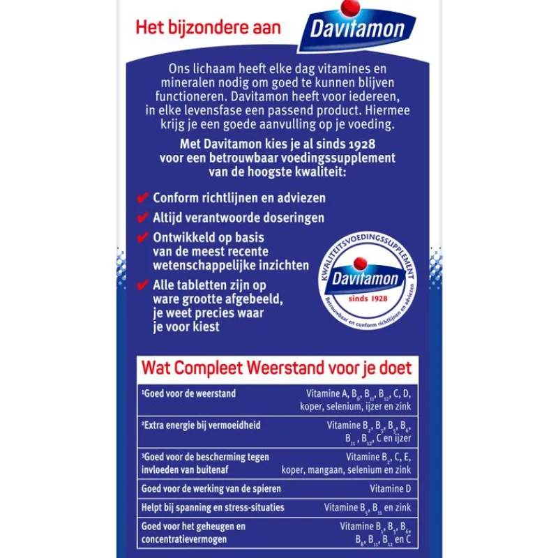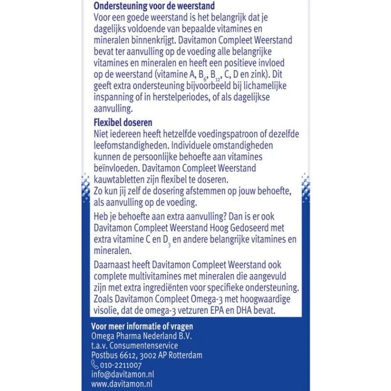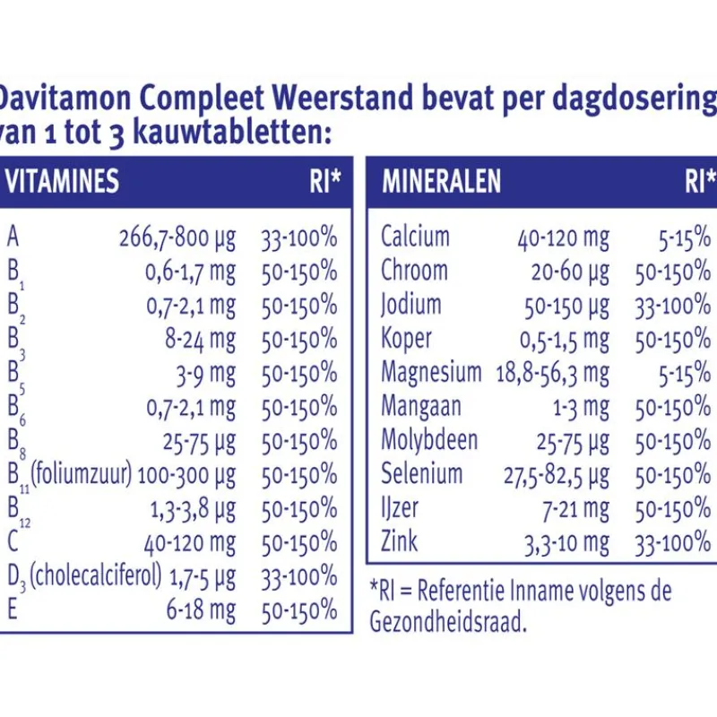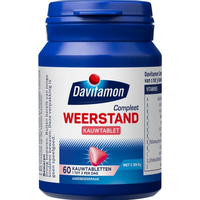 Je lichaam heeft dagelijks vitamines en mineralen nodig om goed te blijven functioneren en een goede gezondheid in stand te houden. Gezond en gevarieerd eten is de basis om voldoende vitamines en mineralen binnen te krijgen. Maar soms kan aanvulling in de vorm van een voedingssupplement, zoals Davitamon Compleet Weerstand KauwVitamines raadzaam zijn.