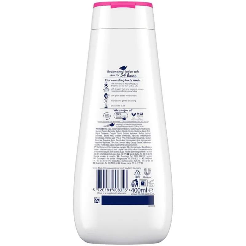 Dove Advanced Care Replenishing Douchegel verandert je dagelijkse douche- of badroutine in een echt verwenmomentje. Dove Replenishing Douchegel heeft een lichte geltextuur en is verrijkt met huidverzorgende voedende bestanddelen. De bodywash reinigt op milde wijze, hydrateert je huid en helpt om haar natuurlijke glans te herstellen met vitaminerijk dragonfruit en voedende kokoscrème. De douchegel bevat de 24-uur vernieuwende MicroMoisture-formule voor een 24 uur lang gehydrateerde, zijdezachte huid. Deze voedende douchegel is gemaakt met natuurlijke milde reinigers en plantaardige moisturisers en is zacht voor het microbioom. De douchegel bevat geen sulfaatreinigers, is voor 94% biologisch afbreekbaar* en is verpakt in 100% gerecyclede plastic flessen**. Dove Replenishing Douchegel heeft een veganistische formule en is door PETA gecertificeerd als ‘vegan’. *94% van de ingrediënten breekt af in kooldioxide, water en mineralen (OESO-testmethoden 301, 302, 310). **M.u.v. de dop en labels.
