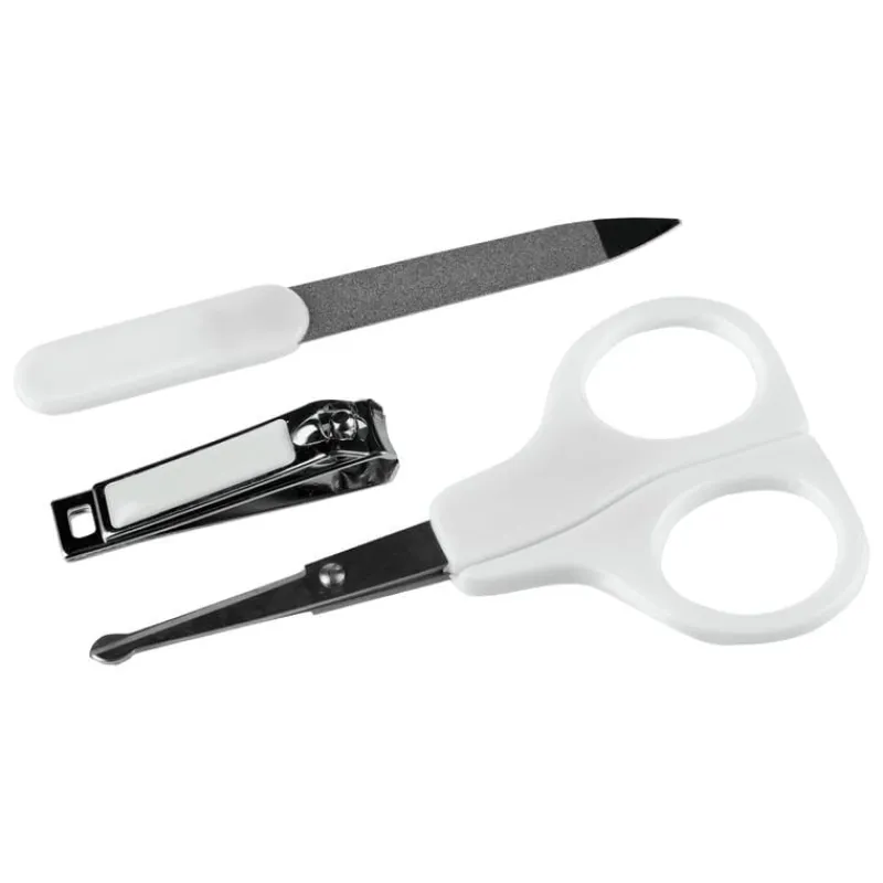 De Etos manicure set bestaat uit een schaartje met afgeronde punten, een nagelknippertje met gebogen knipkantjes