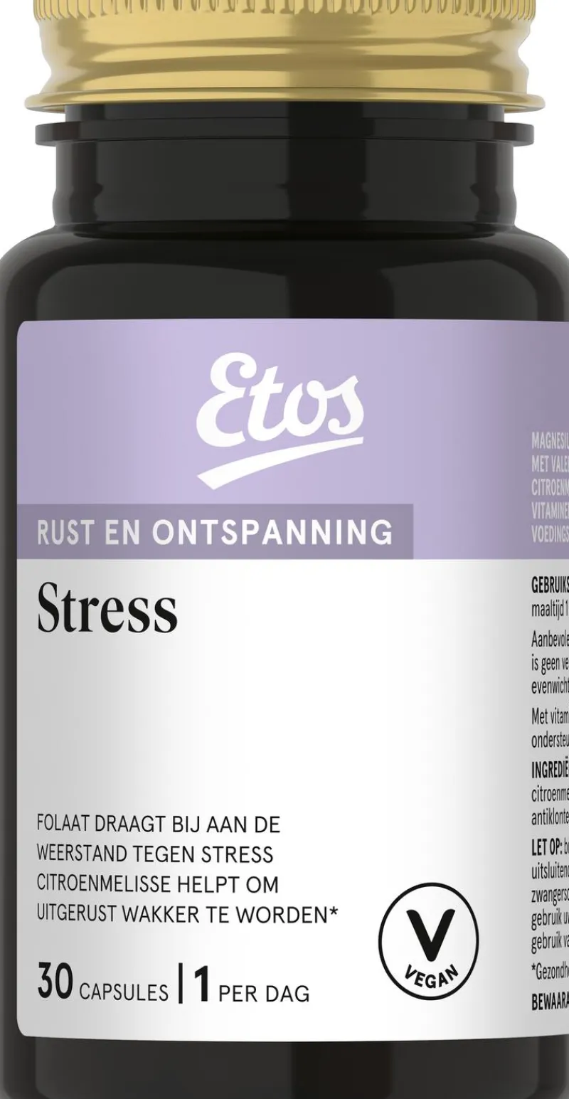 Etos Stress capsules zijn speciaal samengesteld ter ondersteuning in stressvolle situaties. De formule bevat onder andere magnesium, foliumzuur, citroenmelisse- en valeriaanextract, aangevuld met vitamine B5 en B12. Foliumzuur draagt bij aan de weerstand tegen stress en vitamine B5 ondersteunt het lichaam in stresssituaties. Vitamine B12 is goed voor het concentratievermogen.Een voedingssupplement is geen vervanging van een gevarieerde voeding en een gezonde levensstijl.