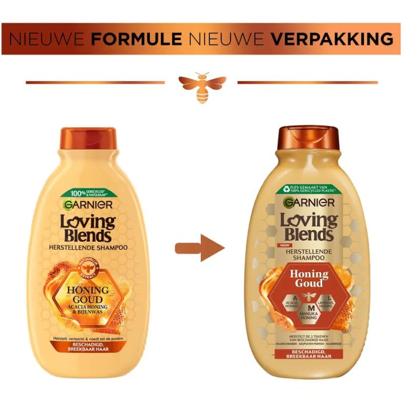 De Loving Blends Honing Goud Shampoo van Garnier is onze ultieme shampoo voor beschadigd haar. De wetenschap van de 3 herstellende honingen: acacia, manuka en lavendel, bekend om hun herstellende, versterkende & voedende eigenschappen. Samengebracht in onze herstellende shampoo om de 3 voornaamste tekenen van haarbeschadiging zo intens mogelijk te herstellen: – -53% haarscheuren* – 2x minder gespleten punten** – 10x minder haarbreuk** Garnier zet zich in voor green beauty. Formule zonder siliconen, voor een natuurlijk gevoel. 100% gerecyclede, recyclebare fles én navulbare fles***. Duurzaam geproduceerde acacia honing. Loving Blends is gecertificeerd door Cruelty Free International. Loving Blends steunt The Bee Conservancy. Ecologische impact Garnier zet zich voortdurend in om de ecologische en sociale impact van haar producten te verminderen tijdens hun gehele levenscyclus, dus inclusief gedurende de productie- en gebruiksfase. Daarnaast streven wij ernaar om jou op een transparante manier toegang te geven tot deze gegevens, zodat jij beter geïnformeerde beslissingen kunt maken over welke producten je aanschaft. Daarom lanceert Garnier het Product Impact Labelling Systeem. Om zo transparant mogelijk te zijn is deze methode ontwikkeld met de hulp van onafhankelijke wetenschappelijke experts en de gegevens zijn gecontroleerd door het onafhankelijke Bureau Veritas. Dit product krijgt een B. *Oppervlakteschade, Instrumentele test na het gebruik van shampoo + masker. **Instrumentele test na gebruik van shampoo en conditioner of na het masker alleen. ***100% gerecyclede plastic fles, met uitzondering van de kleurstoffen, additieven en de dop.