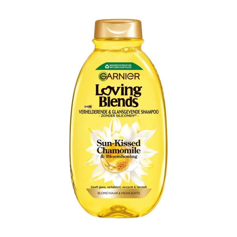 Garnier Loving Blends Sun-Kissed Chamomile & Bloemhoning shampoo reinigt mild, geeft glans, verheldert, verzacht & herstelt. Ontdek de verzachtende kracht van Kamille en de voedende werking van Bloemhoning. Samengevoegd in een verhelderende & glansgevende formule die de beschadigde haarvezels herstelt*, verzacht & een langdurige, verhelderende glans onthult. Voor gezond stralend blond haar met natuurlijke reflecties. De formule is geschikt voor alle verschillende types blond: natuurlijk, gehighlight & gevoelig. Garnier zet zich in voor Green Beauty. Ontdek voor nog meer verzorging de gehele routine. Garnier zet zich voortdurend in om de ecologische en sociale impact van haar producten te verminderen tijdens hun gehele levenscyclus, dus inclusief gedurende de productie- en gebruiksfase. Daarnaast streven wij ernaar om jou op een transparante manier toegang te geven tot deze gegevens, zodat jij beter geïnformeerde beslissingen kunt maken over welke producten je aanschaft. Daarom heeft Garnier het Product Impact Labelling Systeem geïntroduceerd. Om zo transparant mogelijk te zijn is deze methode ontwikkeld met de hulp van onafhankelijke wetenschappelijke experts en de gegevens zijn gecontroleerd door het onafhankelijke Bureau Veritas. *Instrumentele test na gebruik van shampoo + conditioner.