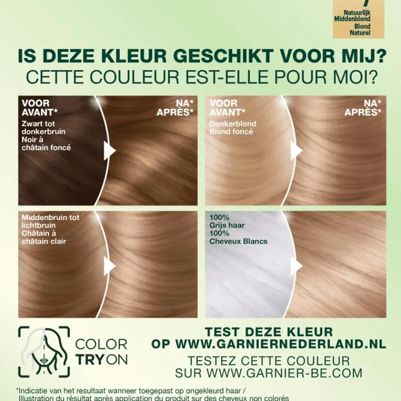 VOORZORGSMAATREGELEN HAARKLEURSTOFFEN KUNNEN ERNSTIGE ALLERGISCHE REACTIES VEROORZAKENLees en volg de instructies.Dit product is niet bestemd voor gebruik bij personen jonger dan 16 jaar.TIJDELIJKE TATOEAGES MET ZWARTE HENNA KUNNEN LEIDEN TOT EEN VERHOOGD RISICO OP EEN ALLERGISCHE REACTIE.Kleur uw haar niet als:• u last heeft van uitslag in het gezicht of van een gevoelige, geïrriteerde of beschadigde hoofdhuid• u eerder een reactie na een haarkleuring heeft gehad• u in het verleden een reactie heeft gehad na een tijdelijke tatoeage met zwarte hennaALLERGIE NEGEREN KAN LEVENSBEDREIGEND ZIJN Het is noodzakelijk een ALLERGIE WAARSCHUWINGSTEST 48 uur vóór iedere haarkleurbehandeling uit te voeren zelfs indien u al eerder een kleurproduct heeft gebruikt.Denk eraan het product 48 uur van te voren te kopen. (lees en volg de gebruiksaanwijzing). Bij een reactie of bij twijfel, raadpleeg een arts voordat u een kleurproduct gebruikt.”De ontwikkelvloeistof’’ bevat waterstofperoxide.“Het kleurproduct”a bevat: fenyleendiaminen, resorcinol, fenyleendiaminen (tolueendiaminen), ammoniak.• Bijgevoegde handschoenen dragen.• Contact van het product met de ogen vermijden. Niet gebruiken voor het kleuren van wimpers of wenkbrauwen. • Bij contact van het product met de ogen onmiddellijk met overvloedig water spoelen • Spoel het haar na de inwerktijd van het product goed uit.Wacht 2 weken na een permanent of een behandeling met een duurzaam gladmakend product.Niet gebruiken als uw haar gekleurd is met henna of een progressieve kleuring. Buiten bereik van kinderen houden.VOLG DE GEBRUIKSAANWIJZING Raadpleeg de ingrediëntenlijst onder dit kader.