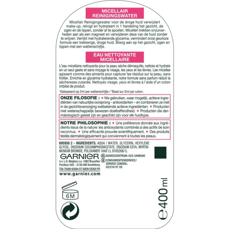 Garnier SkinActive Micellair Reinigingswater voor de Droge Huid met 0% alcohol*. Verwijdert make-up, reinigt en hydrateert in 1 handeling het gezicht, de ogen en de lippen, zonder af te spoelen. Garnier Micellair reinigingswater is een oplossing met een zachte, geurloze formule en is geschikt voor alle huidtypes, ook voor de meest gevoelige huid. Het micellair water is verrijkt met micellen die afkomstig zijn uit de farmacie. Het zijn reinigende deeltjes die als een magneet onzuiverheden, make-up en talg op de huid aantrekken en zo van de huid verwijderen, zonder te wrijven. Verrijkt met hydraterende glycerine, vermindert onze geurloze formule een trekkerige, droge huid. Breng aan op het gezicht, ogen en lippen met een wattenschijfje.