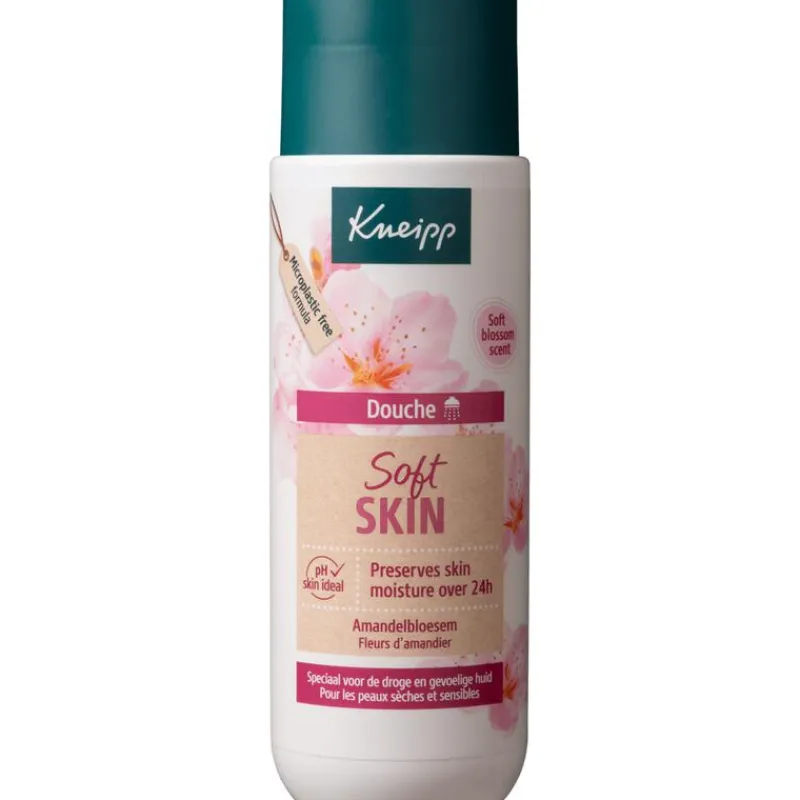 Kneipp® douche Soft Skin – Amandelbloesem is een mild reinigende en verzorgende douchegel die speciaal geschikt is voor de gevoelige huid. Door de voedende amandelolie en rijke sheabutter blijft het vochtgehalte van de huid op peil* en wordt uitdroging van de huid voorkomen. Ook biedt deze zeepvrije douche extra ondersteuning voor het behoud van de natuurlijke huidbarrière. Geniet van de heerlijke geur en een zachte soepele huid na het douchen. **Bevestigd door wetenschappelijk onderzoek.