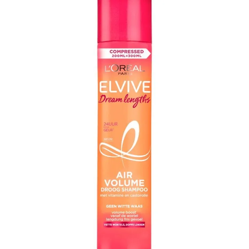 Klaar met vet haar & weinig volume? Elvive Dream Lengths Air Volume Dry Shampoo! Deze droogshampoo absorbeert vet & boost je volume, zonder een witte waas. Stel je wasbeurt uit met deze onzichtbare fix, die je de hele dag textuur & volume geeft. Het resultaat De Elvive Dream Lengths Air Volume Dry Shampoo zorgt voor een onmiddellijke volume boost vanaf de wortels en een langdurig fris gevoel. Dit komt doordat de Air Volume Droog Shampoo vitamine en castorolie bevatten die het haar voeden en reinigen. Zodat jouw haarvet wordt vermindert zonder dat er water aan te pas komt.