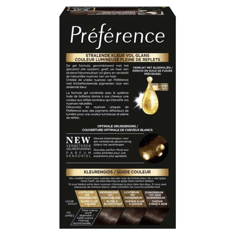 L’Oréal Paris Préférence is een permanente haarkleuring met tot 100% grijsdekking. De kleuring resulteert in een natuurlijke, stralende kleur met reflecties en langdurige glans. De verpakking bevat 5 componenten: kleurgel, ontwikkelcrème, glansbeschermende conditioner, handschoenen en gebruiksaanwijzing. De formule van Préférence bevat een UV-filter voor bescherming tegen zoninvloeden en Vitamine E ter ondersteuning van de haarkwaliteit. De glansbeschermende conditioner kan wekelijks worden gebruikt om de glans in het haar langer te behouden. L’Oréal Paris Préférence is een permanente kleuring voor een stralende en glanzende kleur. Voorzorgsmaatregelen: Doe een allergie waarschuwingstest 48 uur vóór iedere haarkleurbehandeling ook indien je al eerder een kleurproduct hebt gebruikt. In de gebruiksaanwijzing in de verpakking staat beschreven hoe je dit doet. Volg tijdens het kleuren de gebruiksaanwijzing nauwkeurig op. Hoeveel verpakkingen heb ik nodig? Heb je kort haar of haar tot op je schouders? Dan is één verpakking voldoende. Bij halflang tot lang haar heb je twee verpakkingen nodig.Stap 1: Voorbereiding Voordat je begint: bedek je schouders met een handdoek en trek de bijgevoegde handschoenen aan.Giet de kleurgel in de aanbrengflacon met de ontwikkelcrème. Draai de aanbrengflacon dicht en schud krachtig totdat er een gelijkmatig mengsel ontstaat. Draai na het mengen onmiddellijk het uiterste topje van de aanbrengflacon af om ongewenst spatten van het product te voorkomen. Stap 2: Aanbrengen Optie 1: Op het gehele haar Deze optie is geschikt als je het haar nooit eerder hebt gekleurd, het haar 3 maanden of langer niet hebt gekleurd, of een donkerdere kleur wil proberen. Breng aan op het gehele haar. Gebruik de punt van de aanbrengflacon om de haren te scheiden in kleine, gelijke delen. Breng het kleurmengsel eerst aan op de haaraanzet en de hardnekkige grijze haren. Verdeel het mengsel vervolgens over de lengten en breng het aan over het gehele haar. Masseer het kleurmengsel zachtjes in totdat het volledig in het haar gedrongen is. Laat 25 minuten inwerken. Optie 2: Uitgroei bijwerken Deze optie is geschikt als het haar minder dan 3 maanden geleden in dezelfde of een vergelijkbare kleur gekleurd is. Breng aan op de haaraanzet. Gebruik de punt van de aanbrengflacon om de haren te scheiden in kleine, gelijke delen. Breng het kleurmengsel op de haaraanzet in. Masseer in en laat 20 minuten inwerken. Breng vervolgens het kleurmengsel aan op de lengten van het haar. Laat opnieuw 5 minuten inwerken. Stap 3: Spoelen Verdeel een beetje warm water over het haar en masseer het voorzichtig door. Spoel het haar grondig totdat het spoelwater helder is. Stap 4: Verzorging Breng de glans beschermende conditioner aan over het gehele haar en masseer zachtjes in. Laat 2 minuten inwerken en spoel grondig uit. Gebruik 1 keer per week. L’Oréal Paris Préférence is een permanente haarkleuring die tot 100% grijsdekking biedt. In de verpakking van Préférence vind je 5 componenten: de kleurgel, de ontwikkelcrème, de glansbeschermende conditioner en natuurlijk een paar handschoenen en de gebruiksaanwijzing. De kleurgel meng je met de ontwikkelcrème. De Préférence glansbeschermende conditioner kan na de kleurbehandeling meerdere malen gebruikt worden. De conditioner bevat een UV-filter om het gekleurde haar tegen de invloeden van de zon te beschermen en Vitamine E, ter ondersteuning van de haarkwaliteit. Bij wekelijks gebruik van de conditioner zal de glans in het haar langer behouden blijven.
