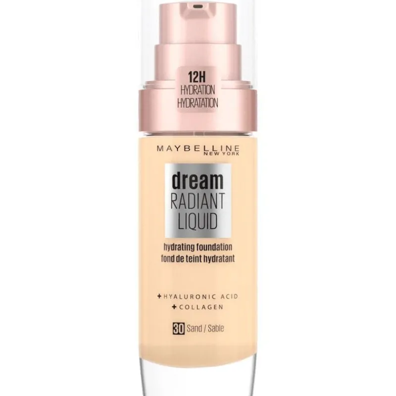 Maybelline New York Dream Radiant Liquid 30 Sand is een foundation met verzorgend collageen en hyaluronzuur voor een egaal uitziende teint Voor een stralende huid + tot 12H hydratatie.
