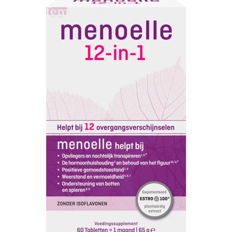 Menoelle 12-in-1 voedingssupplement voor diverse klachten tijdens de overgang. Menoelle helpt bij 12 verschillende overgangsverschijnselen zoals opvliegers, transpireren, gemoedstoestand, vermoeidheid, de hormoonhuishouding, ondersteuning van botten spieren en gewichtstoename. Menoelle bevat naast Salie en diverse vitamines en mineralen, het gepatenteerde en goed onderzochte EstroG-100. Menoelle is natuurlijk, bevat geen hormonen, geen isoflavonen, heeft geen bijwerkingen en kan langdurig worden gebruikt.