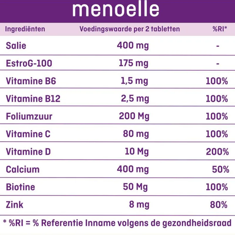 Voor een veelzijdige ondersteuning tijdens de overgangMenoelle helpt bij:• Opvliegers en nachtelijk transpireren¹*• De hormoonhuishouding² en behoud van het figuur⁶*• Positieve gemoedstoestand¹• Weerstand en vermoeidheid⁴• Ondersteuning van botten en spieren⁵Menoelle bestaat uit een optimale mix van vitamines en mineralen en bevat Salie dat diverse lichaamsfuncties ondersteunt tijdens de overgang. Menoelle levert per dag 400 mg Calcium en 10 μg Vitamine D. Zowel Calcium en Vitamine D ondersteunen de botten en is goed voor de spieren.,+ Salie¹ helpt bij opvliegers en nachtelijk transpireren.* + Vitamine B6² goed voor de hormoonhuishouding.+ Vitamine B12³ ondersteunt het normaal functioneren van psychologische functies en mentale performance. + Foliumzuur⁴ draagt bij aan extra energie bij vermoeidheid. + Vitamine C⁵ helpt bij vermoeidheid en ondersteunt het immuunsysteem. + Vitamine D⁵ ondersteunt botten en spieren.+ Calcium⁵ draagt bij aan behoud van sterke botten en spieren.+ Cayenne⁶ helpt bij gewichtsverlies en stimuleert het behoudt van het figuur.*+ Zink voor het behoud van normaal haar, huid en nagels.* Gezondheidsclaim in afwachting van Europese toelating.