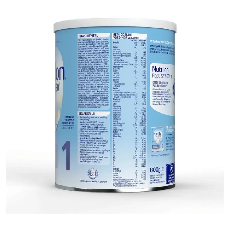 Dieetvoeding bij koemelkallergie, geschikt vanaf 0 tot 6 maanden. Gebruik Pepti Syneo 1 alleen onder medisch toezicht. Wil je Nutrilon Pepti Syneo 1 gebruiken? Overleg dan met je consultatiebureau of arts.