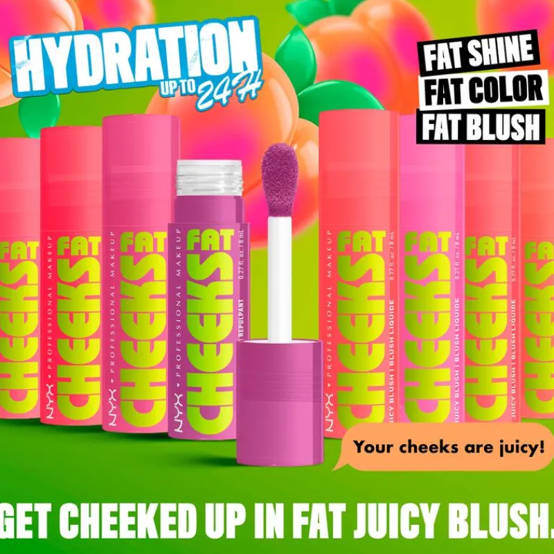 NYX Professional Make Up Fat Cheeks Blush is onze eerste vloeibare blushcrème die jouw huid voorziet van een FAT* blush, FAT* opbouwbare kleur en FAT* verzorging. Klaar om te genieten van next-level benefits? De superzachte formule is verrijkt met een FAT* caring samenstelling van kiwi- en frambozenolie én verstevigende peptiden die je huid voeden en laten stralen. De creamy blush blendt moeiteloos voor een frisse, opbouwbare kleur met een natuurlijke glow. En het beste? NYX Professional Make Up Fat Cheeks Blush is niet alleen voor je wangen – gebruik de blush ook op je lippen of oogleden voor een perfect gecoördineerde, juicy look. Maak kennis met onze eerste liquid blush crème die zorgt voor een stevige hold tot 24 uur lang en een levendig resultaat met een zachte, dewy blos. De superzachte formule verwent je zintuigen met een aangename, sensoriële geur en smelt moeiteloos samen met de huid voor een natuurlijke, stralende finish. Met de innovatieve ingebouwde applicator breng je de blush precies aan waar jij wilt. Voor wangen, lippen en ogen die er net zo goed uitzien als ze aanvoelen. De NYX Professional Make-Up Fat Cheeks Blush is een must-have voor iedereen die houdt van multifunctionele make-up met een frisse, verzorgende finish. Verkrijgbaar in 8 juicy tinten. *intense