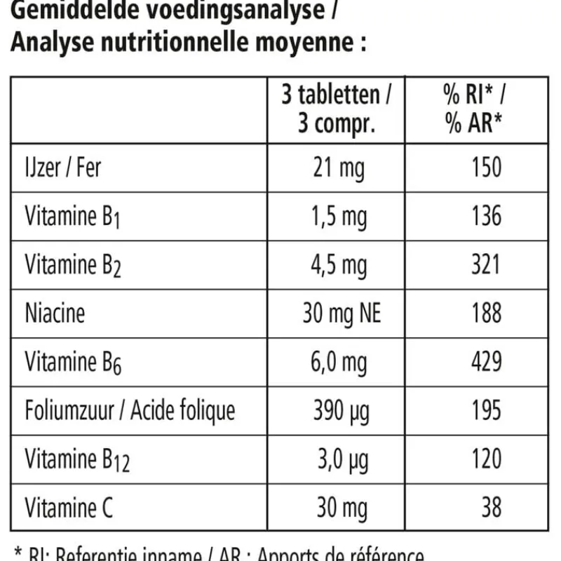 Gistextracten, rijstzetmeel, gedroogd extract (17,4%) van: maltodextrine, spinazieblad (Spinacia oleracea), brandnetelblad (Urtica dioica), venkelvrucht (Foeniculumvulgare), wortel (Daucus carota), duizendguldenkruid (Centauriumerythraea), anti-klontermiddel: siliciumdioxide, ijzer(II)gluconaat, rozenbottelextract (4%) (Rosa canina) (rozenbottelextract, maltodextrine), vitamine C (L-ascorbinezuur), niacine (nicotinamide), vulstof: celstof, anti-klontermiddel: siliciumdioxide, coating: schellak, anti-klontermiddel: magnesiumstearaat, vitamine B6 (pyridoxinehydrochloride), vitamine B2 (riboflavine), anti-klontermiddel: talk, emulgator: polysorbate 80, vitamine B1 (thiaminehydrochloride), foliumzuur, vitamine B12 (cyanocobalamin).