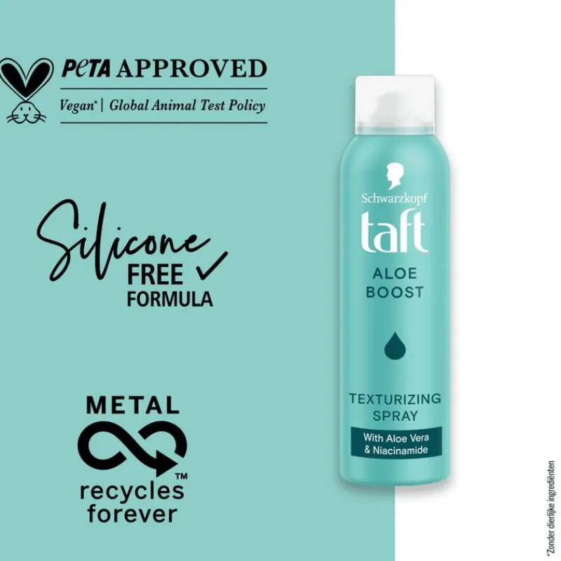 Taft Aloe Boost Texturizing Hairspray geeft het haar textuur en verzorging, voorundone hairstyles and natuurlijke golven. Het geeft je haar extra body en volume. De formule bevat aloe vera om het haar te hydrateren en te verzorgen, en niacinamide om het haar te versterken. Het helpt je kapsel te beschermen tegen vocht. Zonder siliconen.