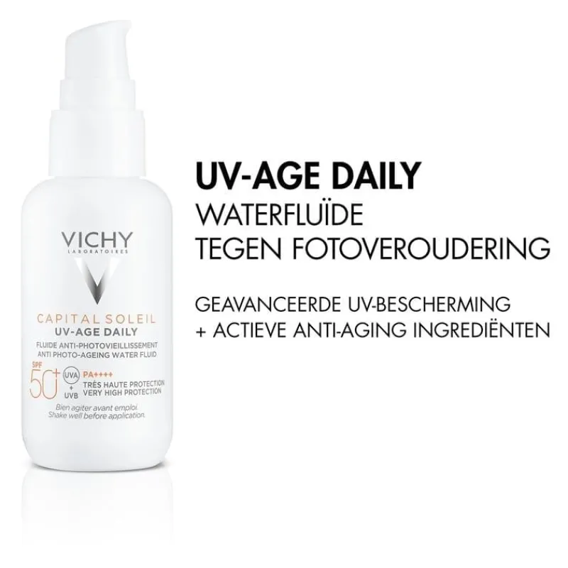 De Capital Soleil SPF50+ UV-Age Zonnefluide van Vichy combineert een dagelijkse UV-bescherming met een anti-aging werking. Het beschermt het gelaat optimaal tegen UV-A/UV-B-stralen en gaat tegelijk de zichtbare tekenen van huidveroudering door de zon (zoals pigmentvlekken en rimpels) tegen.