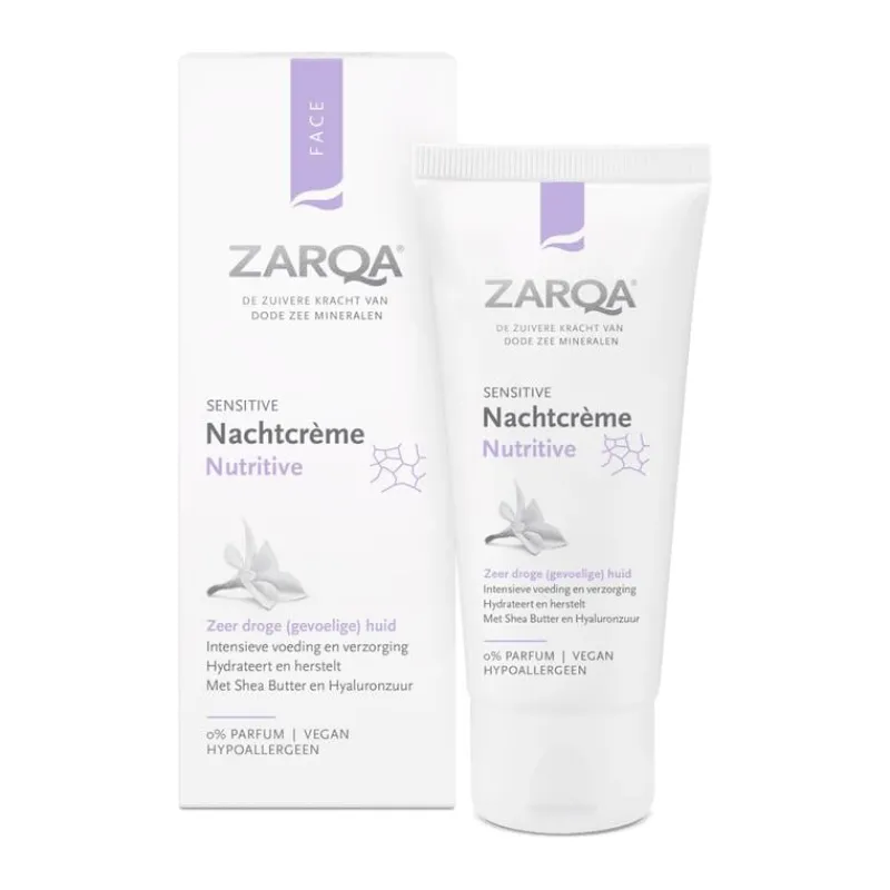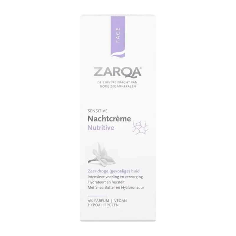 Zarqa Nachtcrème Nutritive is een rijke volle nachtcrème die de droge tot zeer droge (gevoelige) huid intensief voedt. Het zorgt ’s nachts voor een natuurlijk herstel en beschermt op krachtige wijze tegen uitdroging en schadelijke invloeden van buitenaf. Dode Zee Mineralen, Shea Butter, Hyaluronzuur en Vitamine E herstellen ruwe, schrale en schilferige plekjes. Het maakt de huid zacht en soepel. Geschikt voor alle huidtypen, zelfs de meest gevoelige.