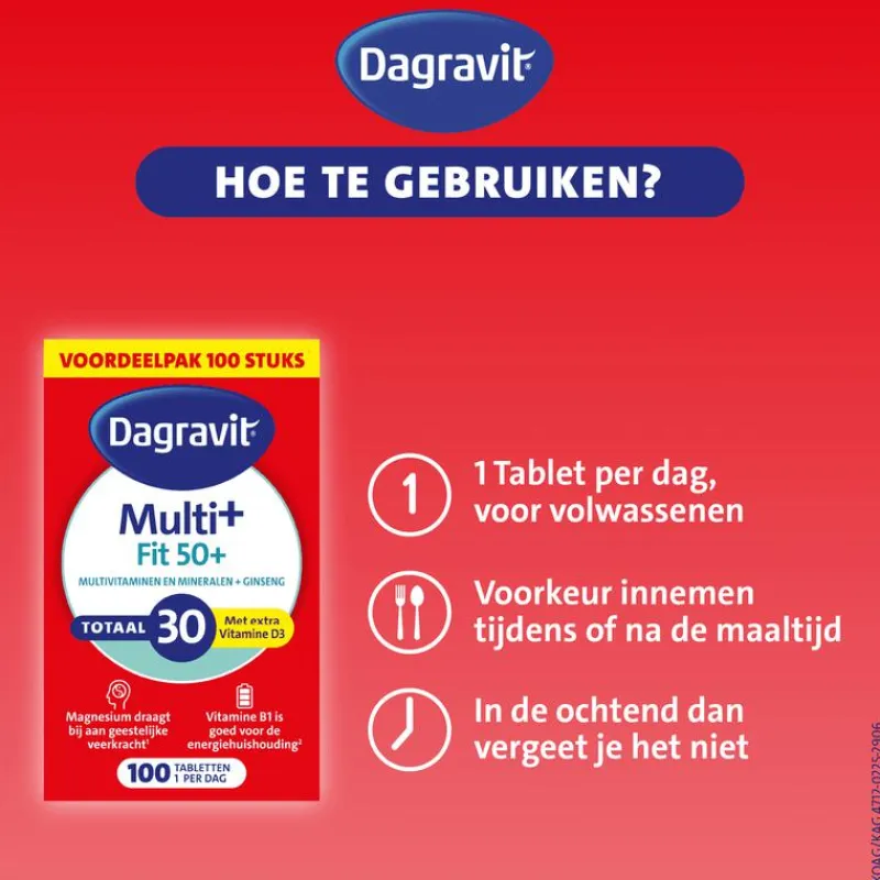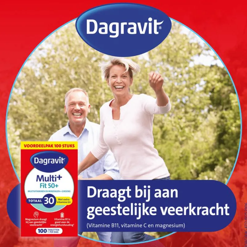 Dagravit Totaal 30 Vitaal 50+ bevat multivitaminen, mineralen en planten, zoals ginseng en Ginkgo biloba, als aanvulling op je dagelijkse voeding. Als we ouder worden, verandert onze behoefte aan voedingsstoffen. Het is daarom belangrijk dagelijks de juiste hoeveelheid vitaminen en mineralen via onze voeding binnen te krijgen. De ene dag lukt dat beter dan de andere dag. Een aanvulling kan dan wenselijk zijn. Met Dagravit ben je van een optimale aanvulling verzekerd.