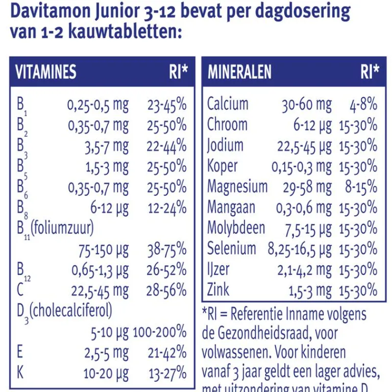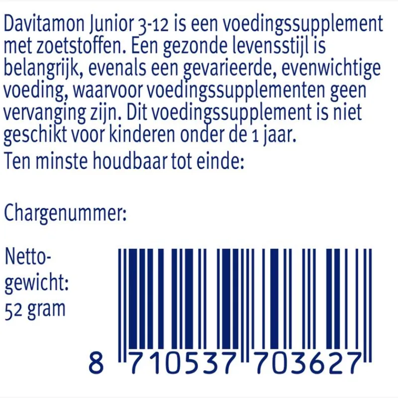 Is je kind jonger dan 4 jaar of komt je kind niet zo vaak buiten? Overweeg dan een voedingssupplement met vitamine D zoals Davitamon Junior KauwVitamines.