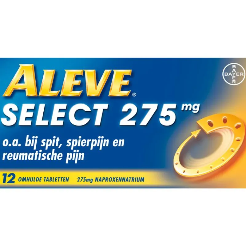 Je wilt van je pijn af om te blijven doen wat je graag wilt doen. Aleve werkt tot wel 12 uur lang, hierdoor hoef je niet zo vaak een tablet in te nemen per dag. Aleve Select is een effectieve pijnstiller met een langdurige werking, 1 pil werkt tot wel 12 uur lang. Overdag en tijdens het slapen. Aleve Select verlicht effectief rugpijn, maar is ook geschikt voor andere pijnen die wat langer kunnen aanhouden. Zoals bijvoorbeeld spierpijn en gewrichtspijn. Aleve Select heeft een tweeledige werking: Het werkt pijnstillend en óók ontstekingsremmend. Aleve Select is effectief en geschikt bij onder andere rugpijn omdat Aleve Select langdurig werkt. Rugpijn is namelijk een pijnsoort die ook vaak wat langer aanhoudt. Bij spierpijn kunnen warmtepleisters in combinatie met een pijnstiller een oplossing zijn. Warmtepleisters kunnen helpen om de spieren te ontspannen door middel van warmte. Aleve Select kan helpen bij verlichting van de pijn door de stof in het lichaam die de zenuwen prikkelt om een pijnsignaal af te geven, te remmen.Tip: Blijf bewegen. Het is belangrijk om in beweging te blijven zodat je lichaam soepel blijft. Pijnstillers helpen bij rugklachten of nekklachten tegen de pijn, waardoor het bewegen minder pijnlijk is.Aleve Select 275 mg, naproxennatrium: niet te gebruiken bij maag-, darm- en andere bloedingen, maagpijn, gelijktijdig gebruik van antistollingsmiddelen, ernstig hartfalen en wanneer u in de laatste 3 maanden van uw zwangerschap bent.