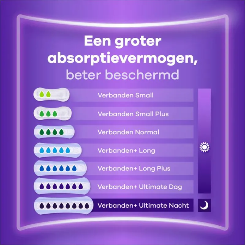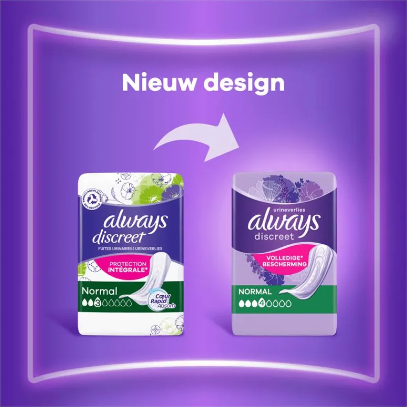 Always Discreet verband voor urineverlies Normal biedt volledige* bescherming en een discrete pasvorm. Elk verband is ontworpen om betrouwbare bescherming tegen lekken te bieden, geurtjes te neutraliseren en onmiddellijk te absorberen. Bovendien is het zacht voor de huid en sluit het mooi aan op je lichaam. Always Discreet verband Normal biedt optimale bescherming en discretie, zodat je je zelfverzekerd kunt voelen wanneer lachen of niezen urineverlies veroorzaakt. *Gebaseerd op onze 5 dimensies van bescherming: betrouwbare bescherming bij urineverlies, onmiddellijke absorptie, exclusieve geurneutraliserende technologie, discreet design, zacht voor de huid.