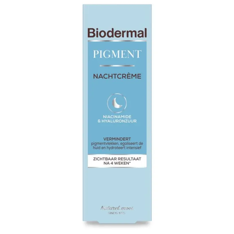 Biodermal Pigment Nachtcrème vermindert hyperpigmentatie, zoals pigmentvlekken, door de celvernieuwing van de huid te stimuleren en overmatige melanineproductie te verminderen. De rijke, maar snel intrekkende crème met effectieve anti-pigment ingrediënten, pakt de oorzaak van pigmentvlekken aan, exfolieert mild en vermindert het teveel aan melanine in de huid. Daarnaast hydrateert het intensief en langdurig, verbetert het de huidtextuur en -elasticiteit en vermindert het fijne lijntjes en rimpels.