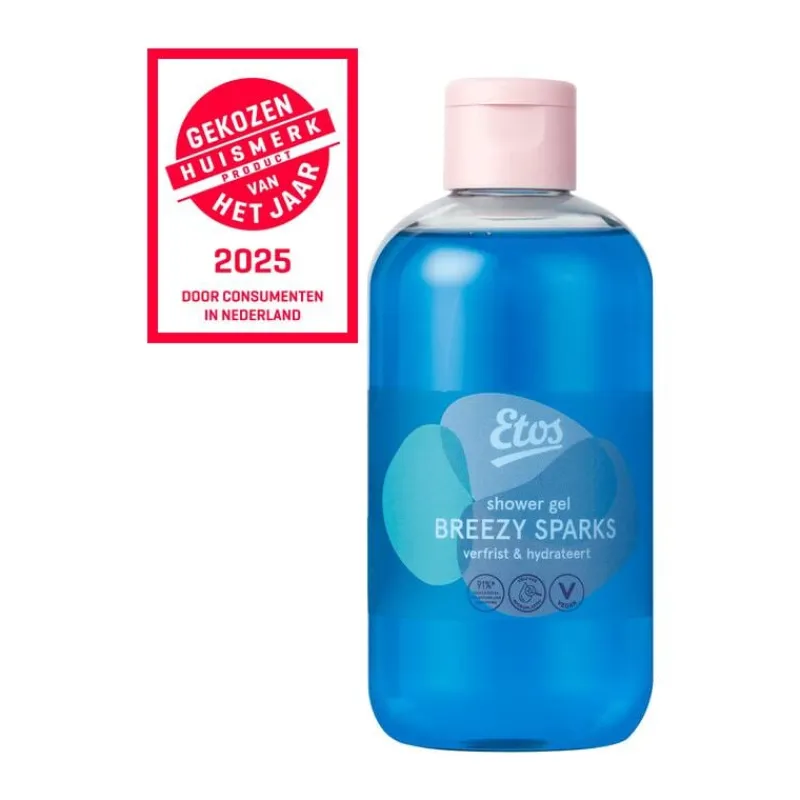 Etos douchegel breezy sparks is verrijkt met een extract van munt en heeft een sprankelend en fris parfum. De vochtinbrengende bestanddelen helpen de huid te verzorgen en hydrateren. Etos Shower gel breezy sparks bevat 91%* ingrediënten van natuurlijke oorsprong en is dermatologisch getest.
