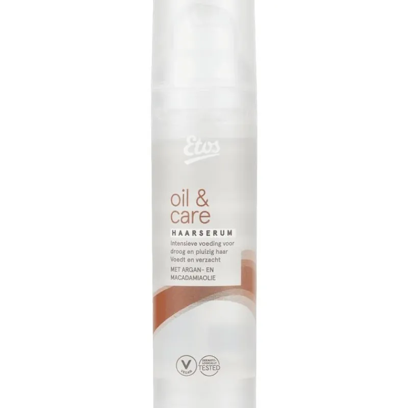 Etos Oil & Care haarserum helpt droog haar te beschermen en voorkomt dat het gaat pluizen .