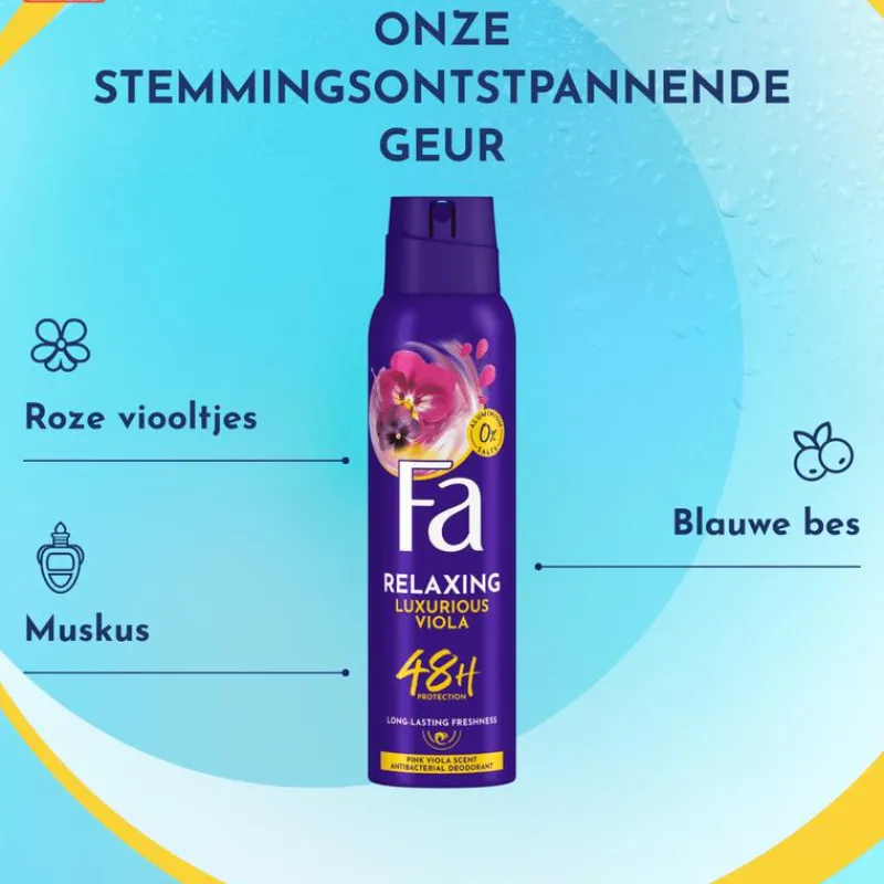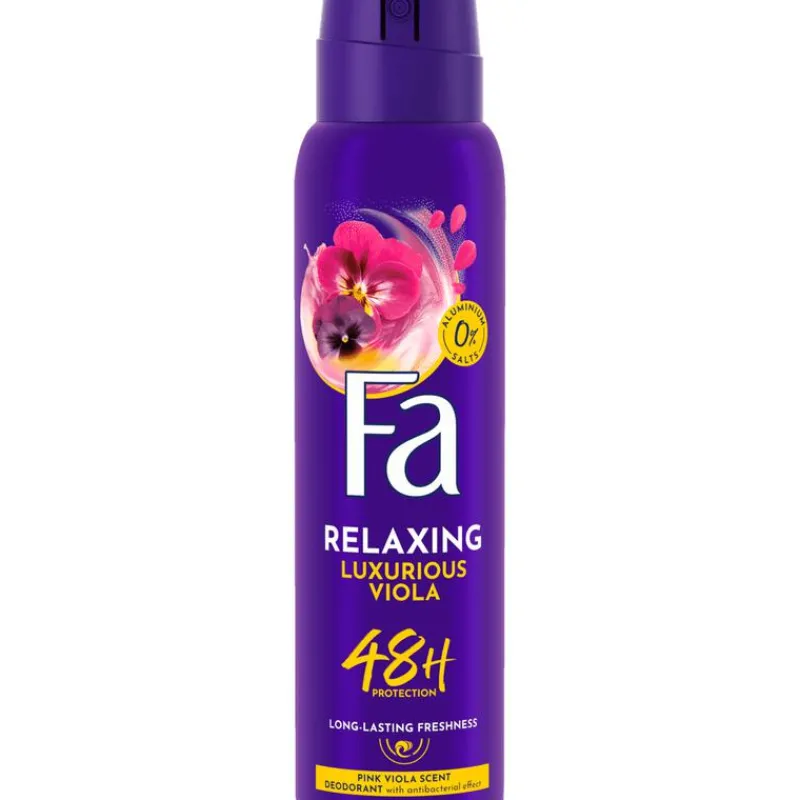 Ontdek Fa Luxurious Viola deodorant spray met de geur van roze viooltjes. De vegan formule biedt 48 uur bescherming tegen nare geurtjes en is vrij van aluminiumzouten.