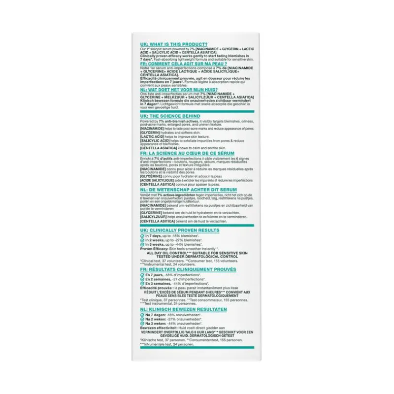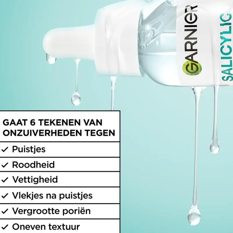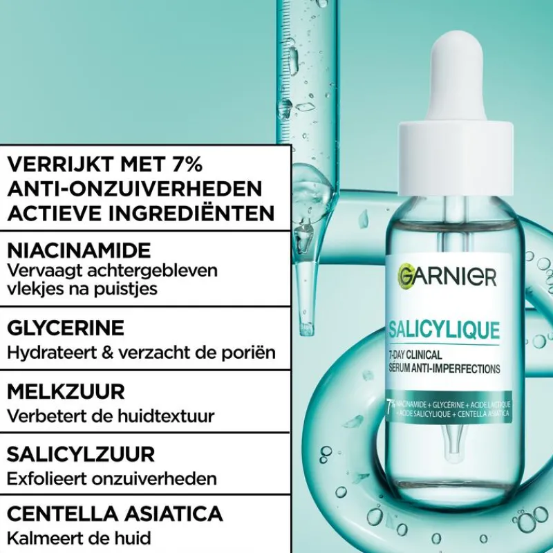 Ontdek ons eerste anti-imperfecties serum: Garnier Pure Active Salicylic Anti-Imperfecties Serum, de formule die klinisch bewezen onzuiverheden zichtbaar vermindert in 7 dagen*. Het Garnier Pure Active Salicylic Anti-Imperfecties Serum gaat 6 tekenen van onzuiverheden tegen en heeft een snel absorberende lichtgewicht formule. Het serum is getest onder dermatologische controle en is geschikt voor de gevoelige huid.
